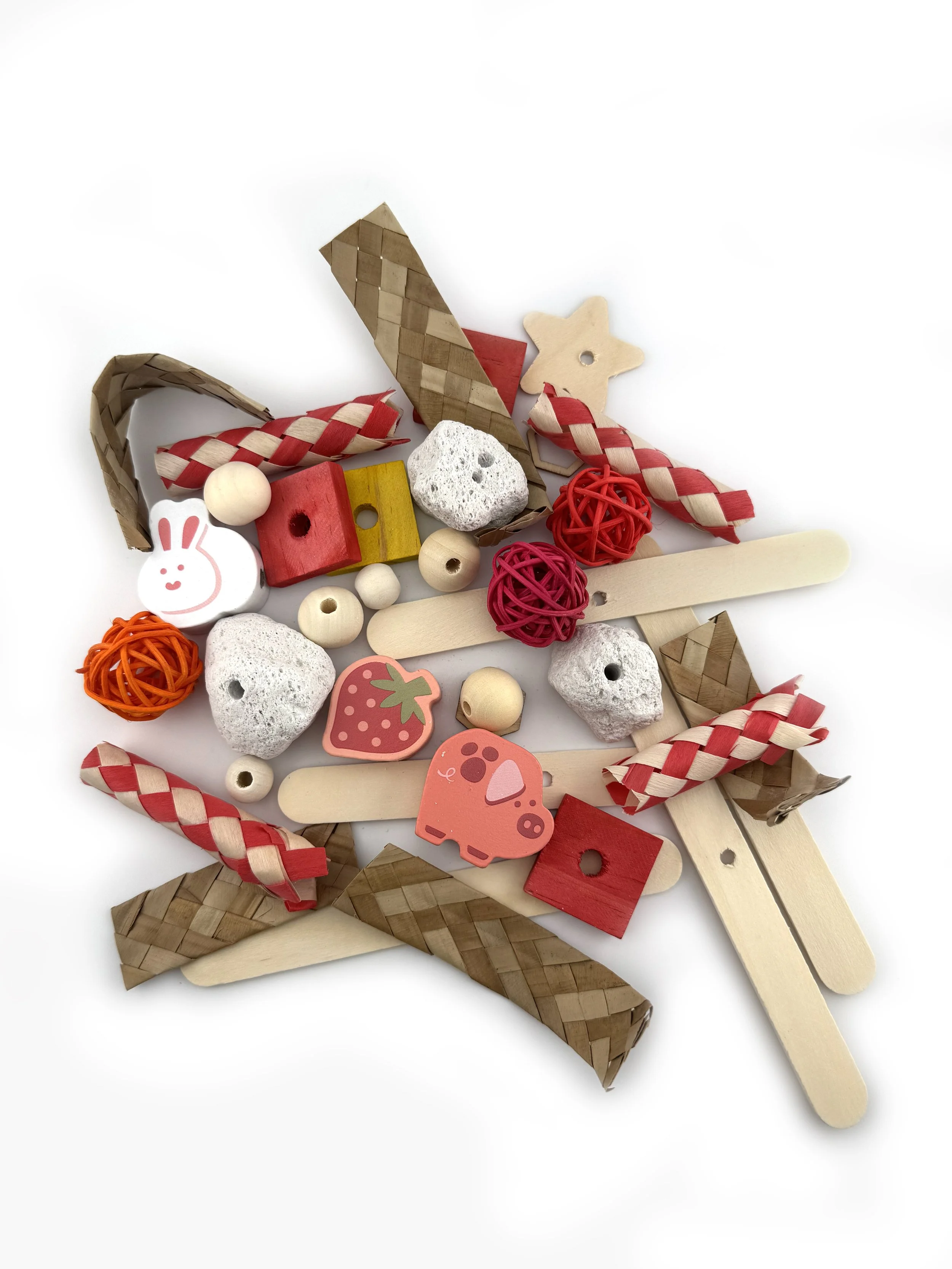 This rat toy refill pack includes a variety of rat-safe chew materials in a red color theme and provides enough pieces to refill one hanging rod up to three times. Designed for our Create-Your-Own Rat Toy Kit but compatible with any refillable skewer or hanging toy.