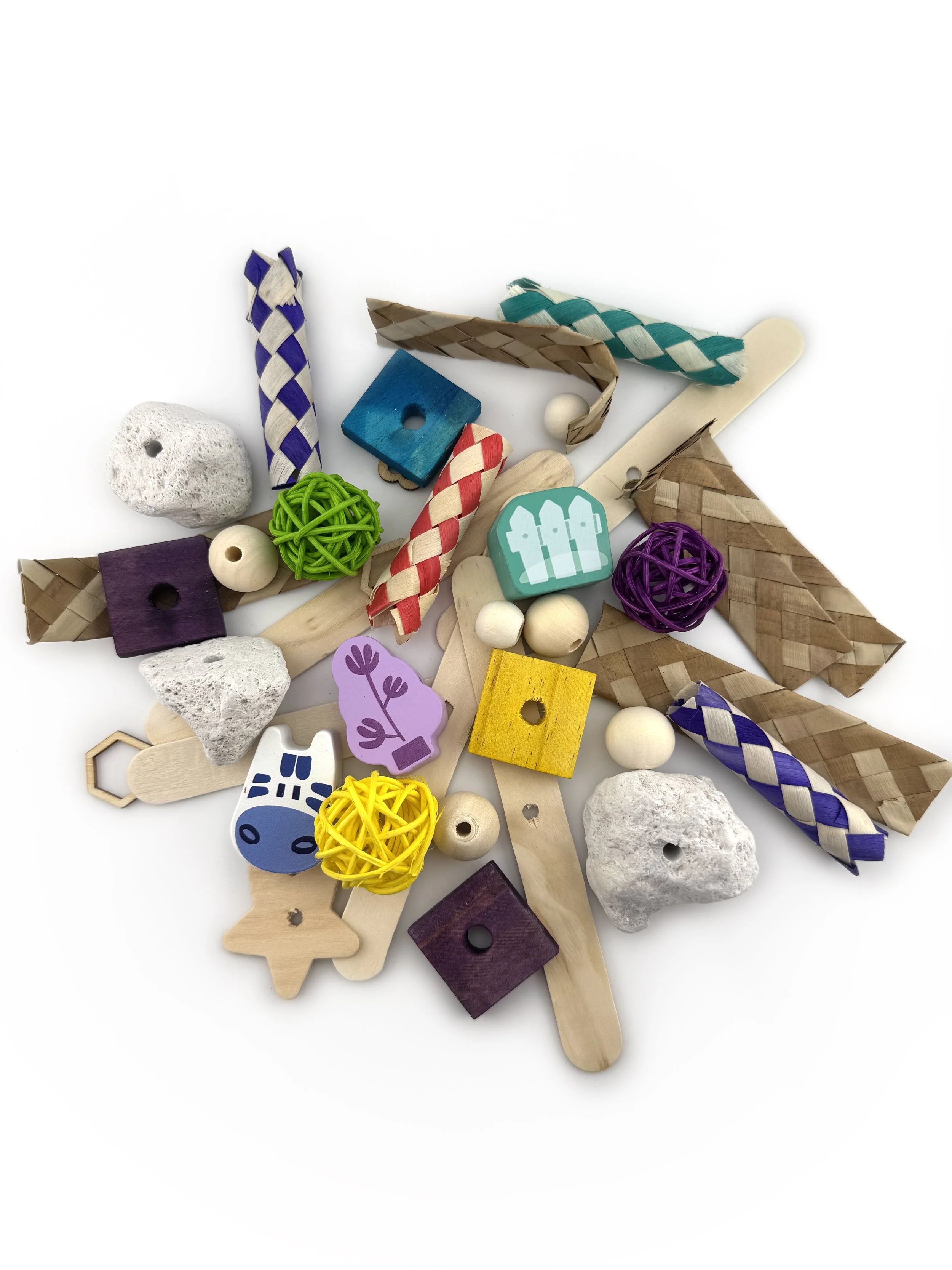 This rat toy refill pack includes a variety of rat-safe chew materials in assorted colors and provides enough pieces to refill one hanging rod up to three times. Designed for our Create-Your-Own Rat Toy Kit but compatible with any refillable skewer or hanging toy.