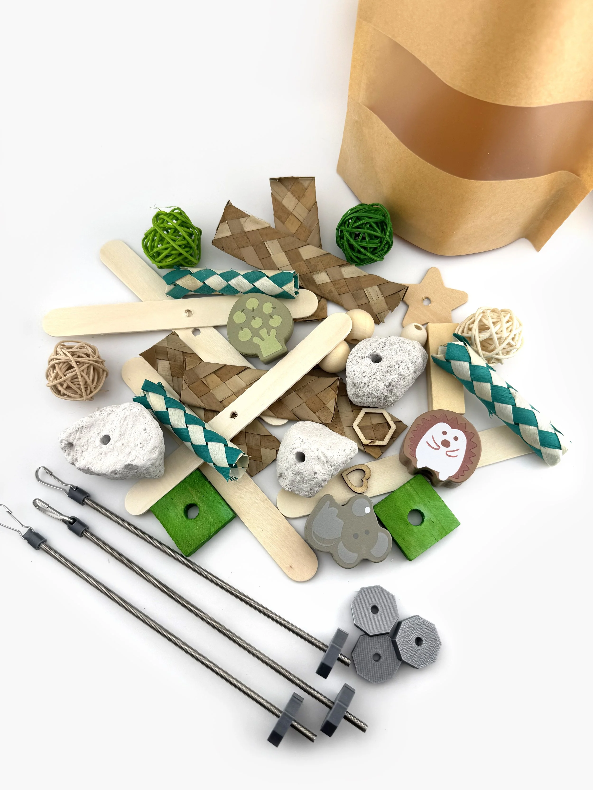 This rat toy refill pack includes a variety of natural, rat-safe chew materials and provides enough pieces to refill one hanging rod up to three times. Designed for our Create-Your-Own Rat Toy Kit but compatible with any refillable skewer or hanging toy.