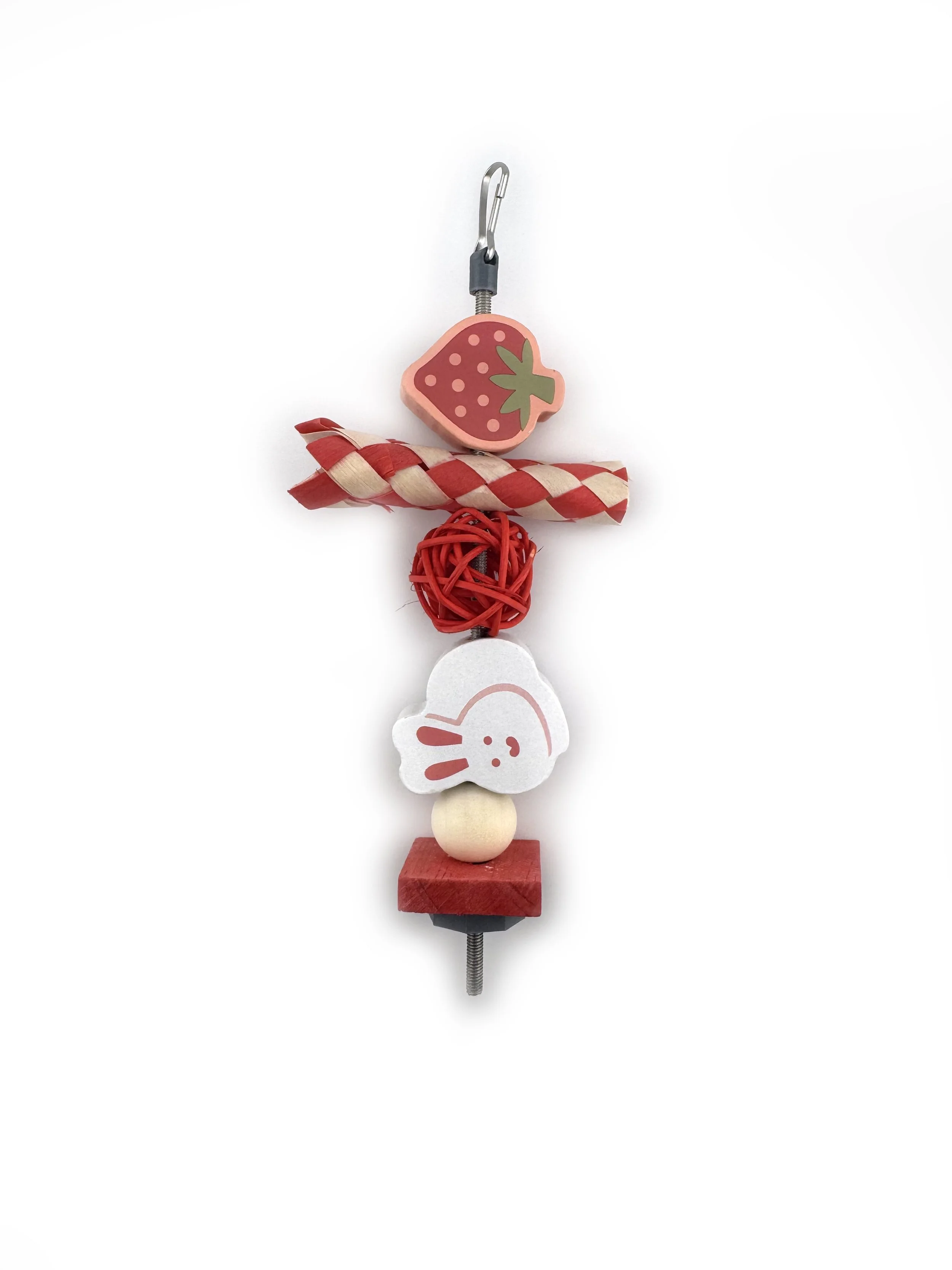 This prefilled hanging rat chew toy comes ready to clip into your cage and is packed with rat-safe chew materials in a red color theme. The stainless steel rod is fully refillable for long-term use.