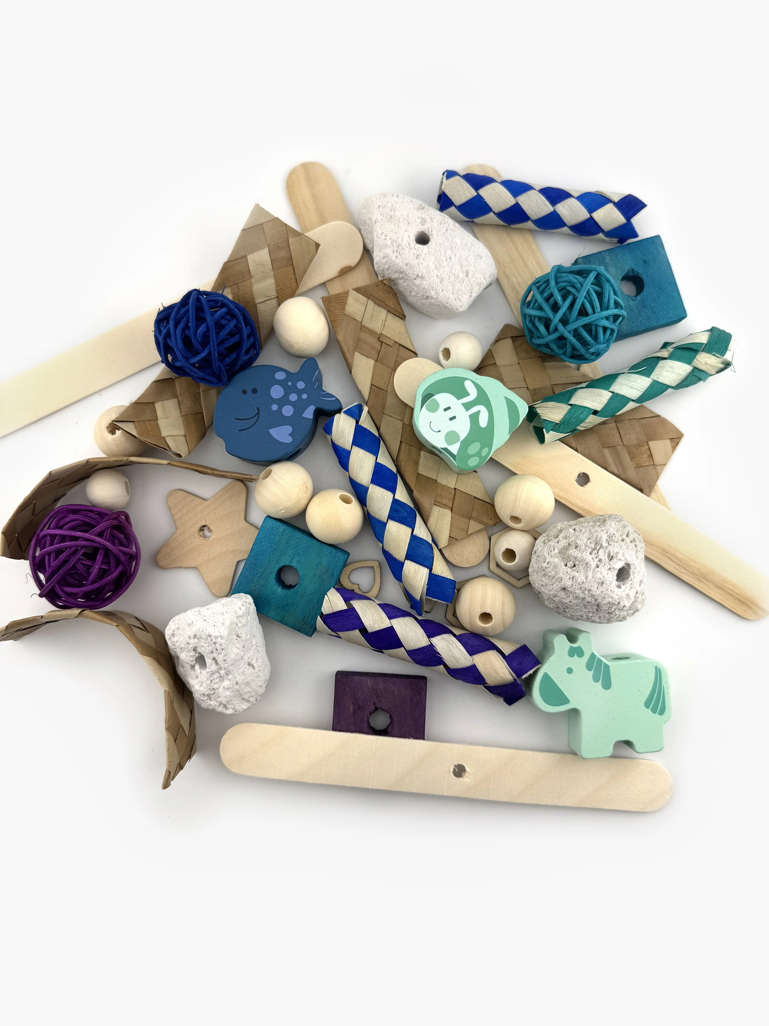 This rat toy refill pack includes a variety of rat-safe chew materials in a blue color theme and provides enough pieces to refill one hanging rod up to three times. Designed for our Create-Your-Own Rat Toy Kit but compatible with any refillable skewer or hanging toy.